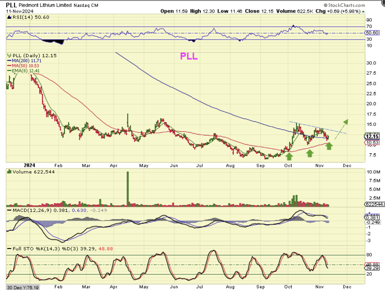 PLL is a little choppier than LAC and SGML, but it seems to be forming a loose bullish triangle pattern. It is also reversing at the 200sma, it formed a large base and has good upside potential too. For example, this triangle formed when it rallied form $7 to $15 and then chopped between $10 & $15. Big moves could come over time.