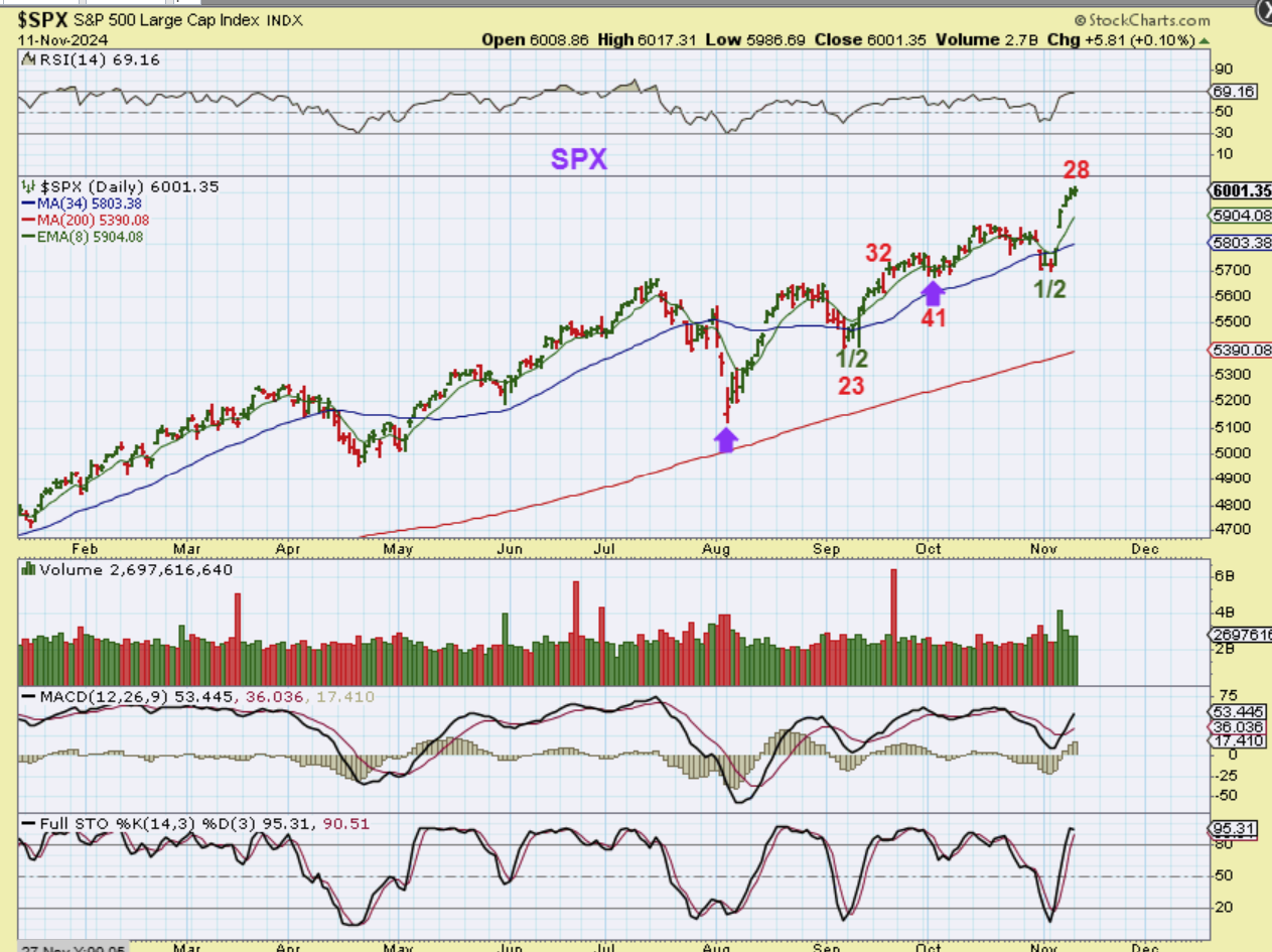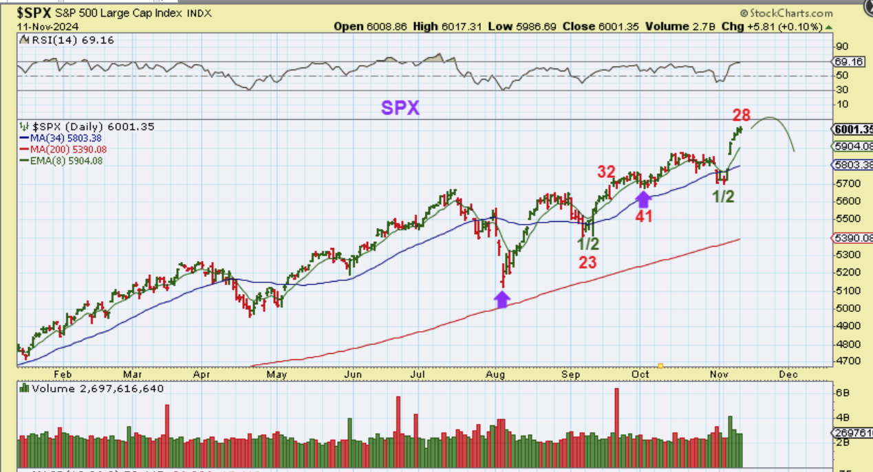 The SPX is in a bit of a runaway move out of the 1/2 cycle dip, and that started with the election results and the rate cut last week. The run out of the first daily cycle peaked at about day 38 with slow choppy price action.