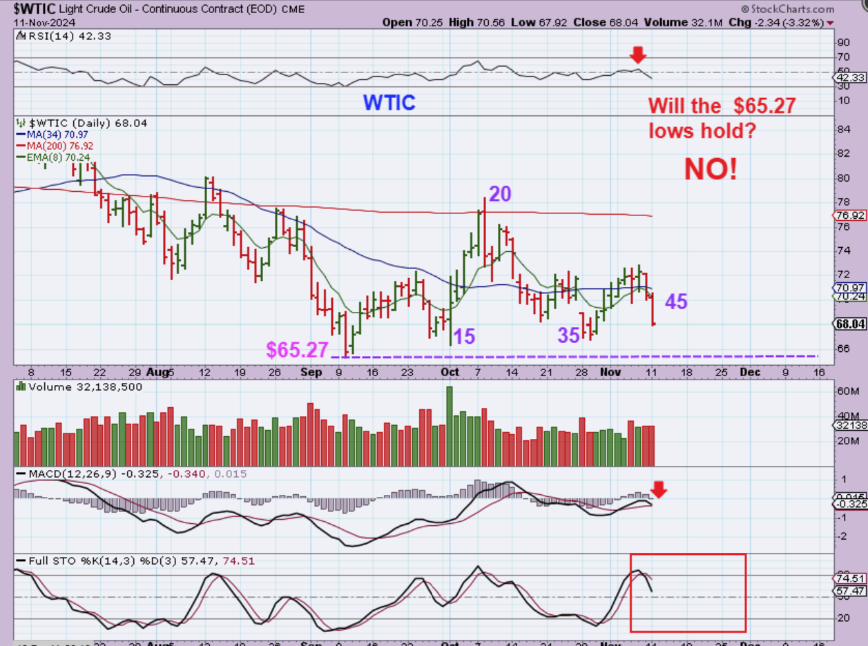 WTIC – oil dropped on day 45 and I do not think that the lows will hold up for a few reasons, but VLO, MRO, APA, OKE, etc look pretty bullish. I am thinking that this may break the Sept lows of $65.27 because e are already L.T. and the stochastics has room to drop. It may just be a quick shake out, based on what the Oil stocks look like.