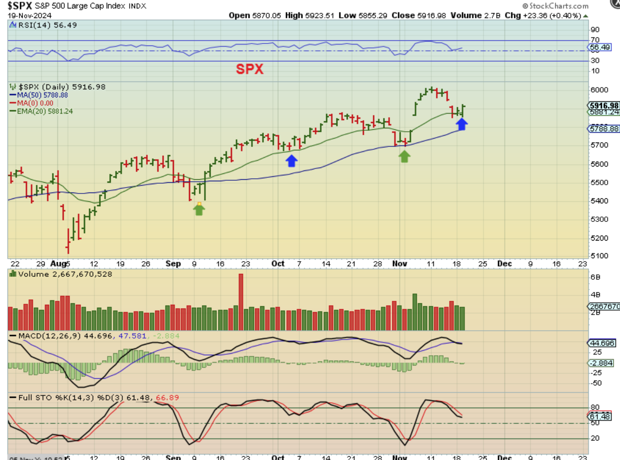 SPX – After Fridays gap down sell off, we had a reversal higher this week at the 20 ema. The SPX & NASDAQ do not look bad, but the SOXX has been a concern…