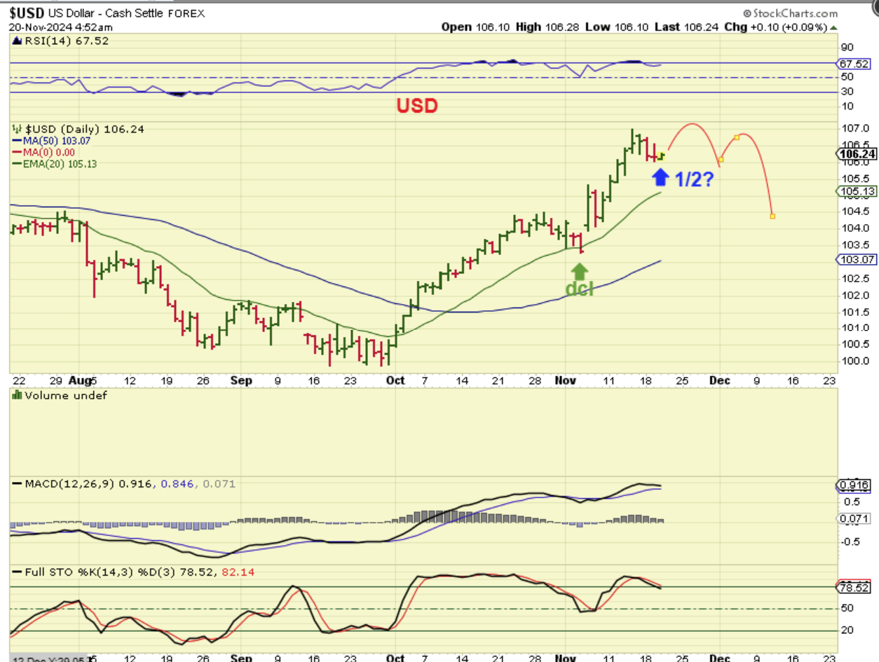 So The USD dipped lower , but that may just be a half cycle dip or pause. This can go higher or start that topping process that I pointed out.