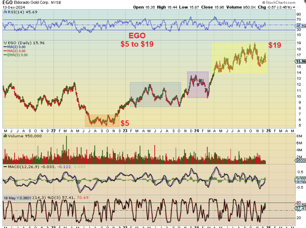 We know that EGO, AEM, AU, HMY, KGC, etc. etc. also used to drive us crazy with the constant choppiness in between rallies, but look at the gains over time. For EGO, $5 to almost $20 is 300% Oct 2023 to Oct 2024, but that choppiness is aggressive here too.