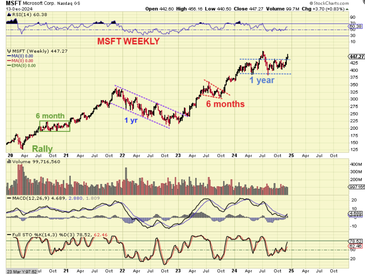 MSFT 5 year weekly – Even on the weekly chart it is easy to see that MSFT ran from $125 in 2020 and is almost $500 4 years later, Awesome gains!!…BUT…was it straight up? Was it easy to hold every week?