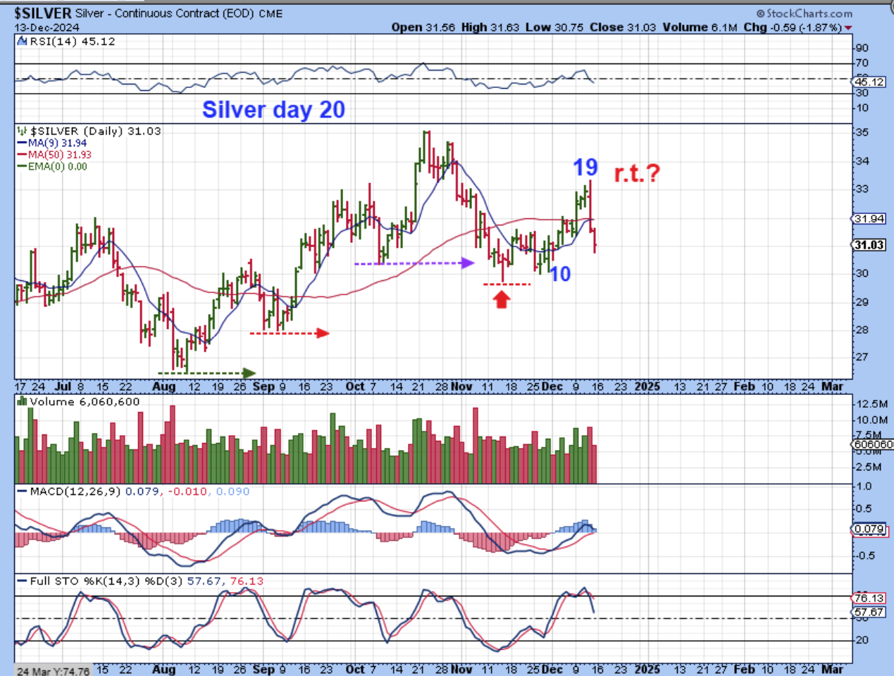 2. Then GOLD rallied into day 7, crashed, and yet now it rallied and made a ‘higher high? It also gives us a R.T. peak at day 19, unless we drop into day 38?