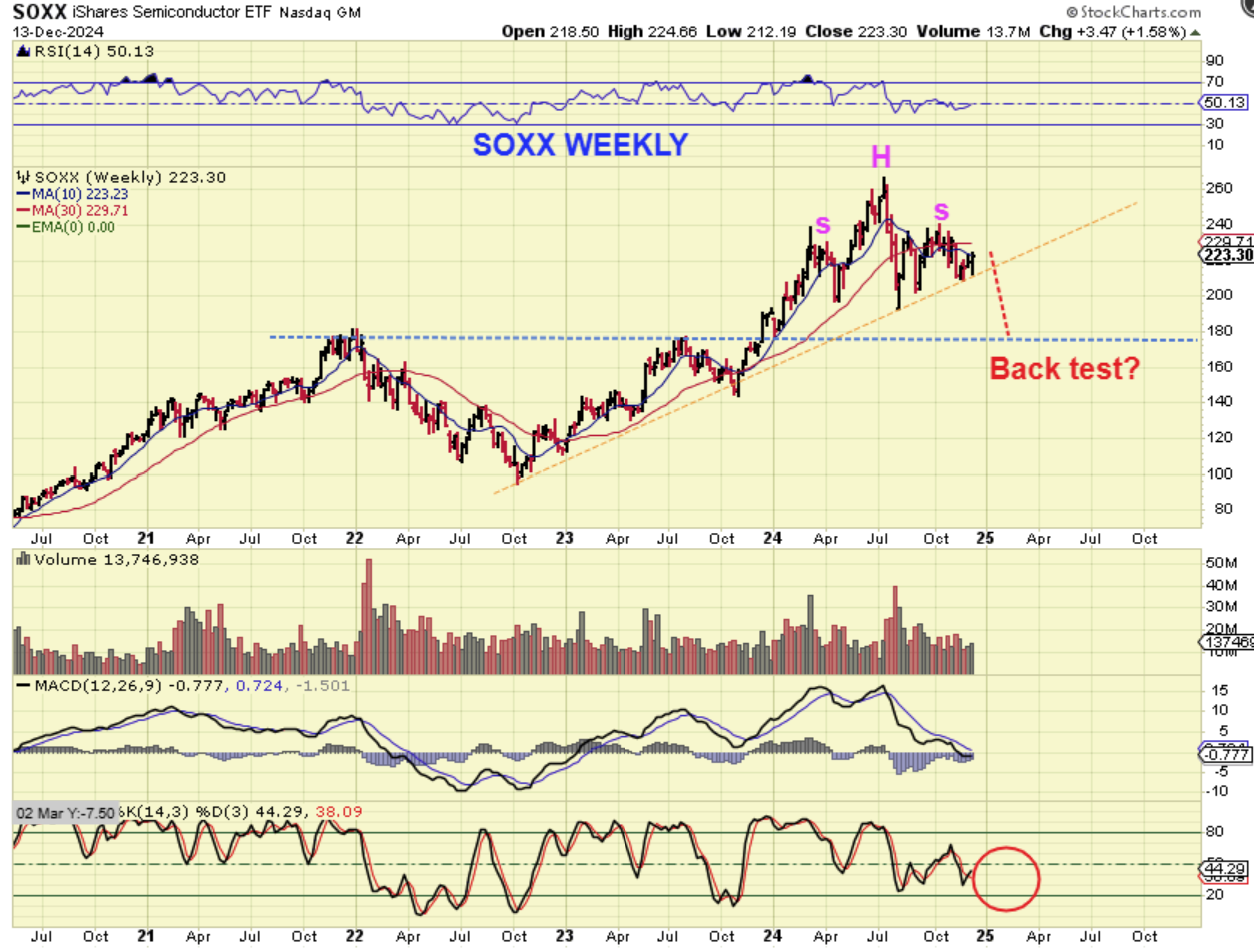 The SOXX WEEKLY looks like a H&S formation with a fairly deep downside target area. This could start to drop at the end of this 3rd daily cycle and then bounce and really drop in the 4th daily cycle. That may line up with February.