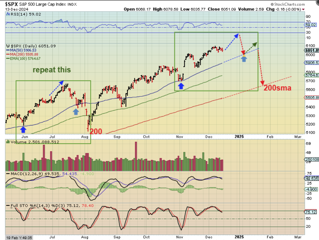 SPX – Now we zoom in and see that in this 3rd daily cycle there is ‘time’ for it to run if it repeats a run similar to that June-July-August time period into an ICL. I drew a continuing run into the end of the year (Santa rally), and eventually a drop toward the 200sma in early 2025.