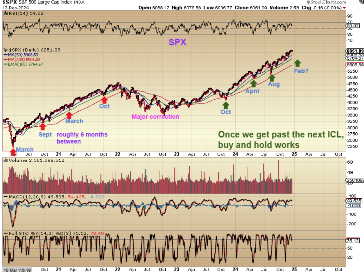 SPX DAILY– Look at the ICLS. They can just be somewhat steep or deep, but in this bull run they can also be fairly quick drops. I used a 100 week ma (green line), because some broke the 50sma and yet didn’t tag the 200sma, so we can keep that in mind. NOTICE THAT ICLs came roughly every 6 months or so, our last one was in August.