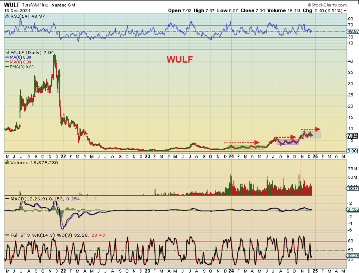 Take WULF for example: It is coming out of a base and makes gains, consolidates, makes gains, consolidates, etc. That may continue until finally buyers just overwhelm it and EVERYONE wants Crypto stocks. Then, at that time, this may get steeper and run higher much more quickly. Anyone that bought and held WULF down at $1 now is holding it at $7. Over time they may be holding it at $20. So that is the BUY & HOLD during good times and bad viewpoint. So let’s take a look at another view point.