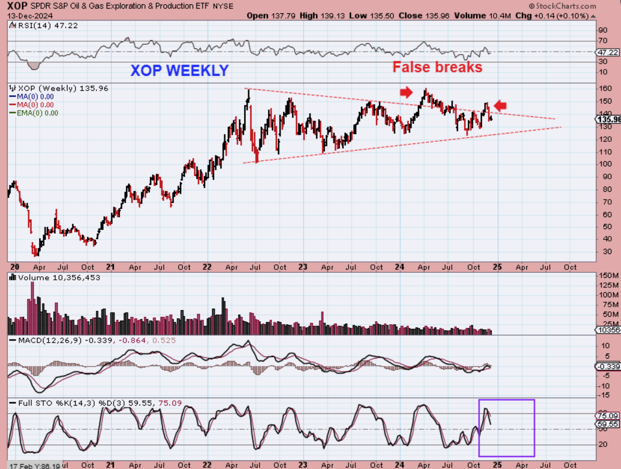 THE XOP broke out and then fell back down sharply a week ago when Oil dropped back toward its ICL Low. It is choppy and can remain that way until Oil picks a direction.