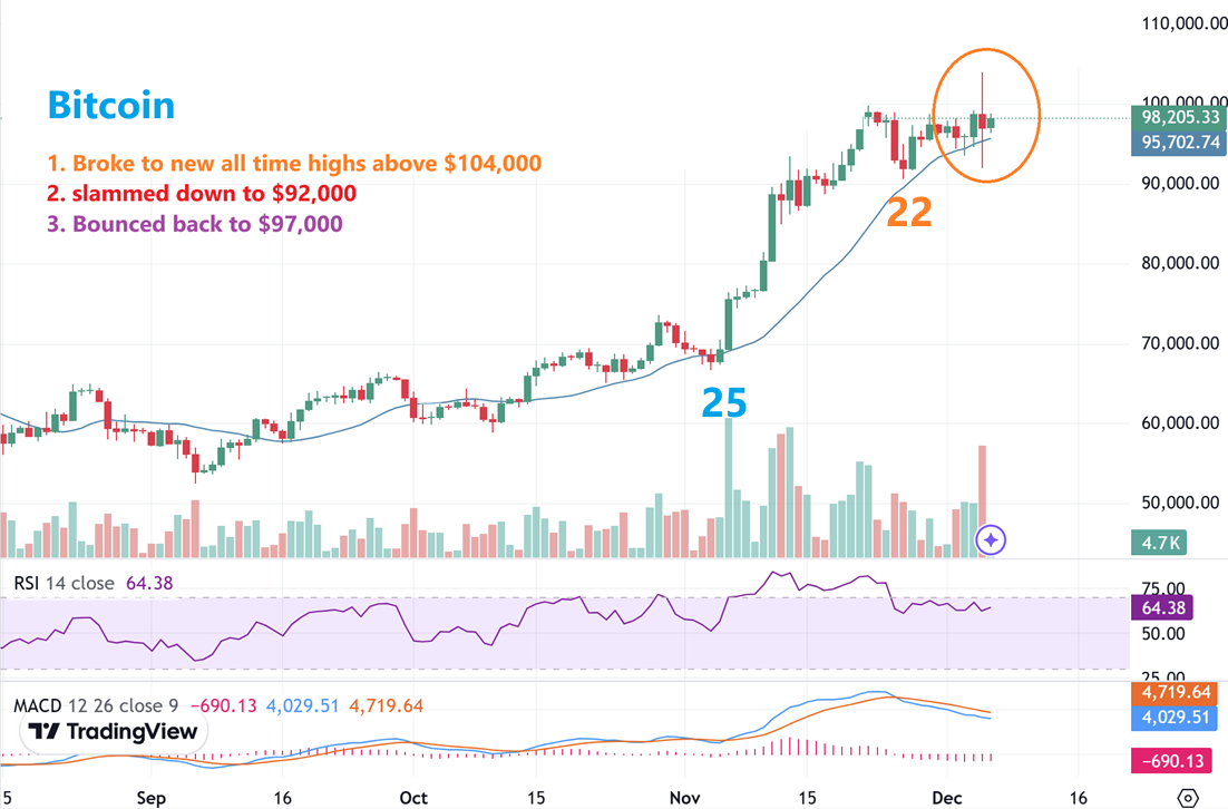 Yesterday Bitcoin broke out above $100,000 and ran to $104,000, but then it sold off and dropped quickly to $92,000, so we’ll need to discuss that below. If you do invest in this sector, you may be interested in what I found pertaining to that large Doji candle at $100,000 yesterday. I will be away for the morning, but I will be home in the afternoon. I am personally quite interested in seeing what Bitcoin & crypto stocks do from here.