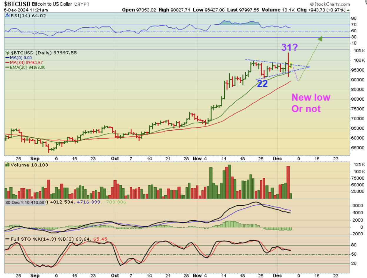 We MIGHT get a new low in the next couple of days on day 34 or so. If so, the drop should be short lived and may tag the 34 sma at $90,000.