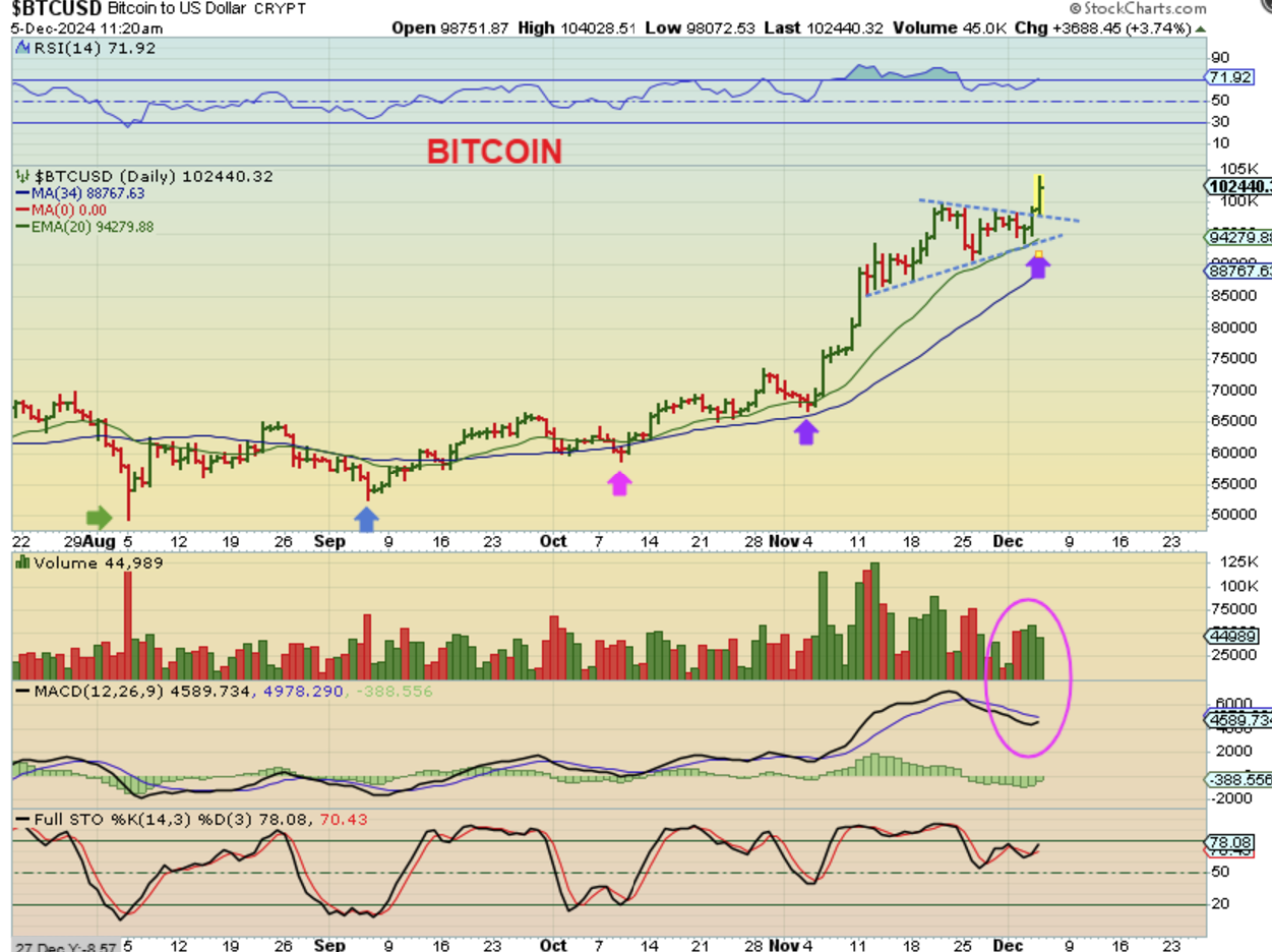BITCOIN – This was an absolutely gorgeous chart of Bitcoin on Thursday morning. We saw Bitcoin break out from a triangle and run up to $104,000, and pre-market my Crypto basket of stocks was FLYING. Yay, right?
