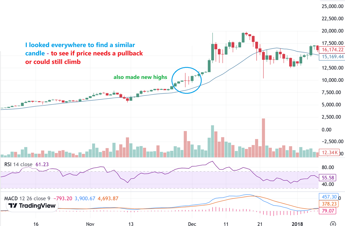 And then I went through my charts and searched for that Dojii candle in Bitcoins past. Did we ever see bitcoin at new highs and suddenly put in a large Doji? And if so, could it still climb higher? The answer was…