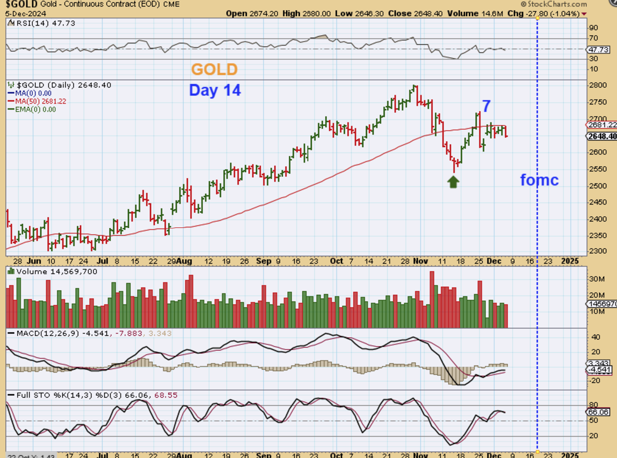 GOLD is on day 14 and it is normal that it has been unable to get above the 50sma, since it should be due for a drop into an ICL. A day 7 peak makes this L.T. and that also fits what we are expecting, with a possible low around the FOMC.
