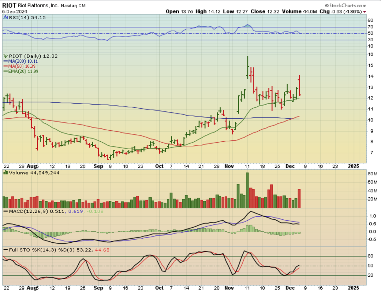 RIOT isn’t a ‘broken’ chart, but a 2 dollar drop from above $14 to $12.27 feels like it was. If you owned 1000 shares, that was a $2000 drop from highs to low. If you held 2000 shares, you saw a $4000 drop from highs to lows. Now multiply that by 5 stocks in your basket and it was a very green day to a very red day, however….The illusion is that we lost a lot of money, but really it gapped open quite a bit and was only down 63 cents at the end of the day.