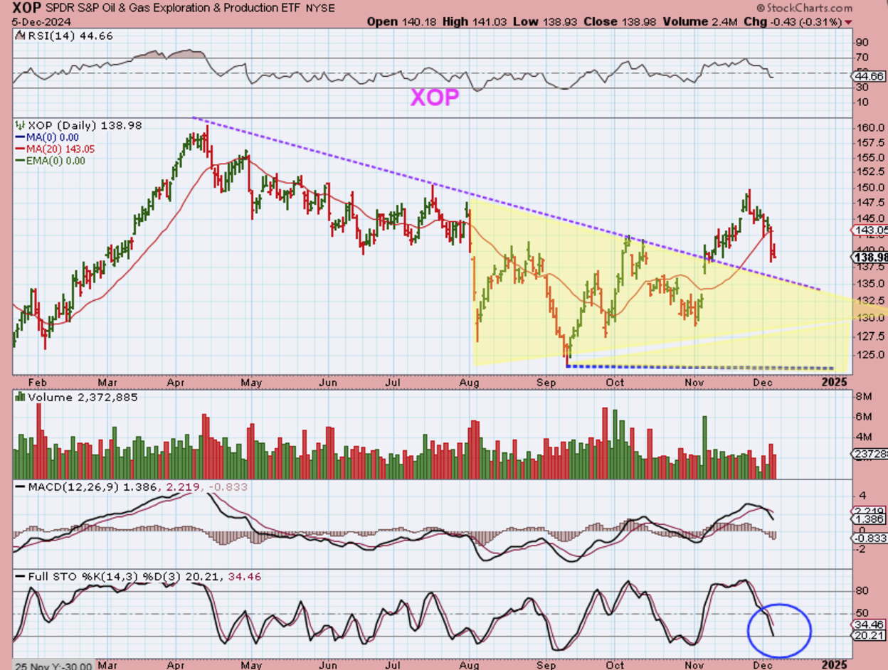 The Oil stocks and The XOP have been dipping lower, and it looks like the XOP is doing a back test of the break out. In the past it climbed above the 20 ema, but on Wednesday it lost that support. This looks like a dcl drop.