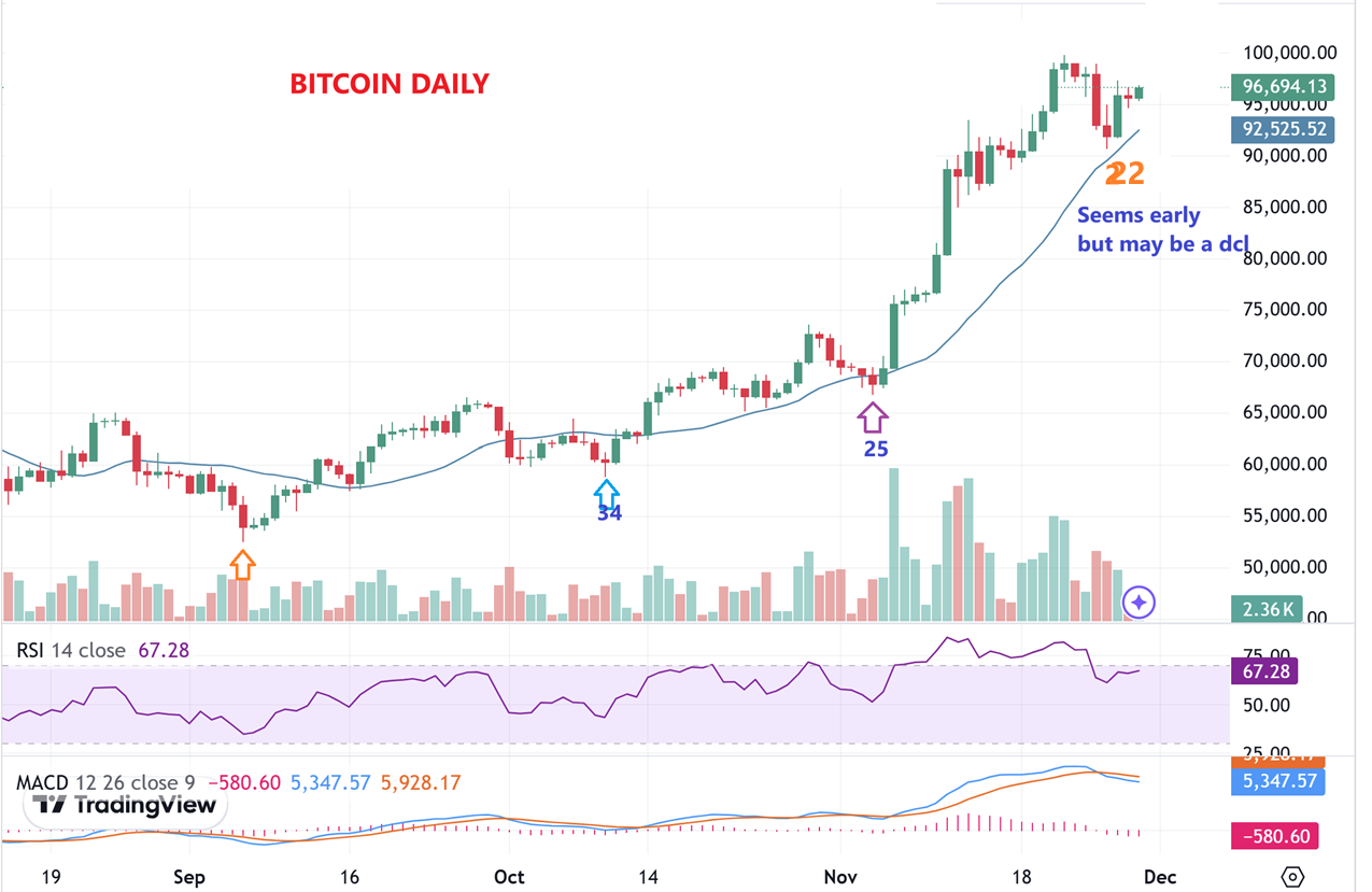 BITCOIN – Wednesday stretched higher, Thursday paused, and today it is trying to move higher. Crypto stocks shot up on Wednesday, so we MIGHT have a day 22 dcl (which is unusually short, but in a Bull market, they can shorten as buyers are always ready to buy the dips).