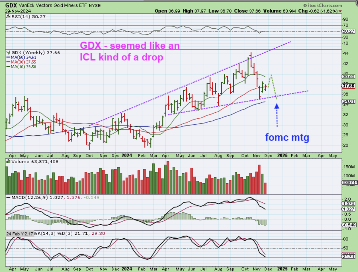 THE GDX sell off was a sharp 4 week drop from October into November. It can bounce and then also drop 1 more time into the fed mtg in December, to hopefully give us out final lows. That drop may only be a slight undercut of the recent sell off lows.
