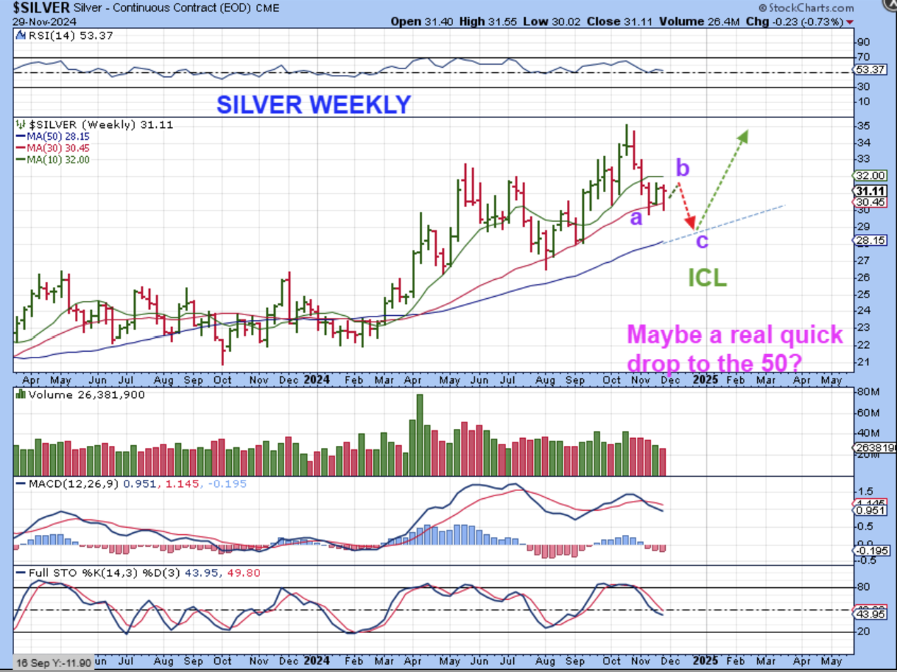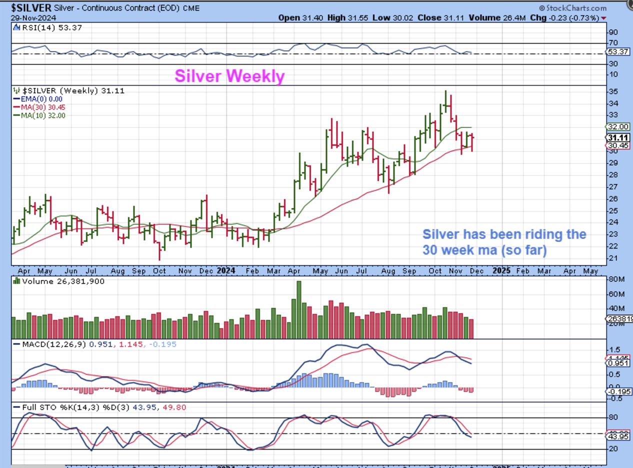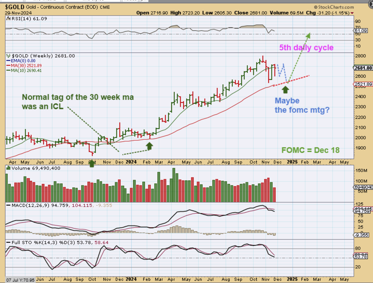 SILVER has been choppy and it has also been bouncing off of the 30 week ma since August. This shows you 3 daily cycles higher out of the August lows, a peak in October, and now we are selling down with some choppy trading until a low is put in place.