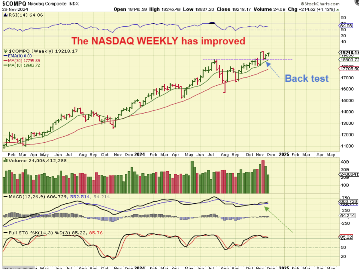 THE NASDAQ WEEKLY chart has improved a little since the US election results. We saw a breakout to new highs, a back test at the 10 week ma, and then a slow continuation higher.