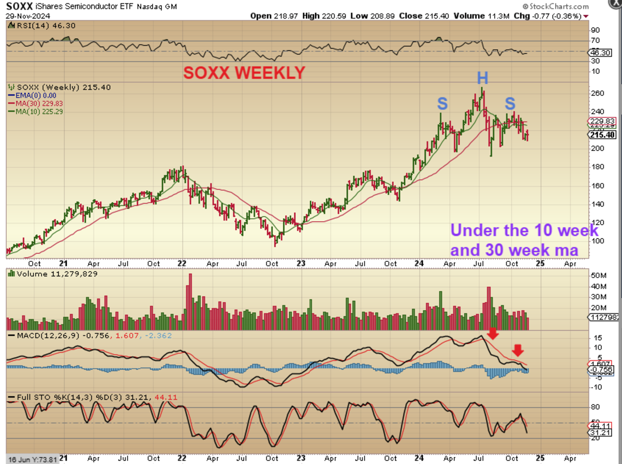 1. The Soxx had that failed daily cycle, and even after the US Election results, it is struggling and dropping lower since October. In fact, it closed the week down and I still clearly see a H&S pattern.