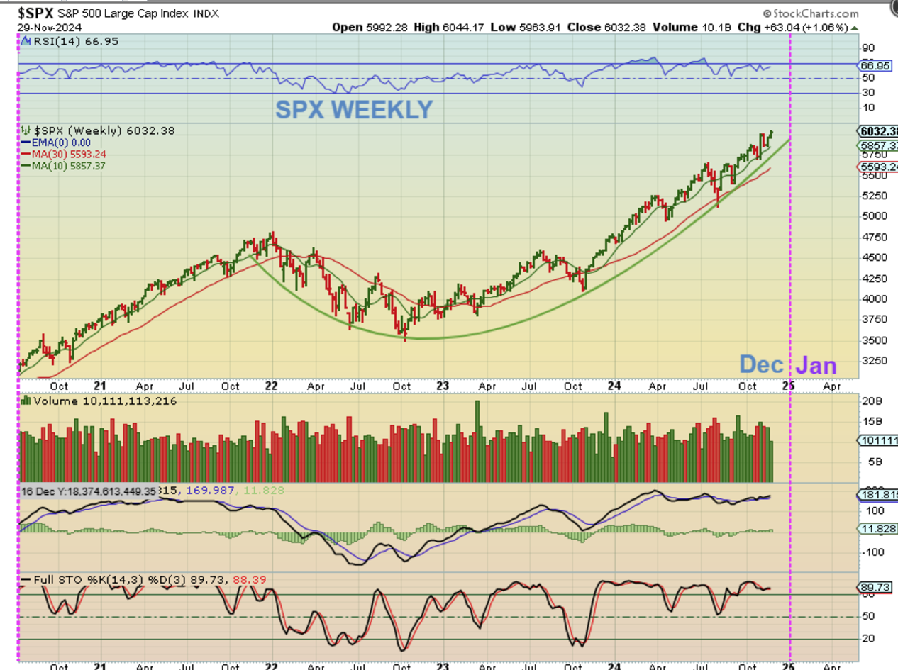 So on this WEEKLY SPX chart I have drawn a line at the end of 2024, and with a possible 40 day- daily cycle, you can see how this COULD climb higher with a ‘Santa rally’ into the end of 2024. We’ll see.