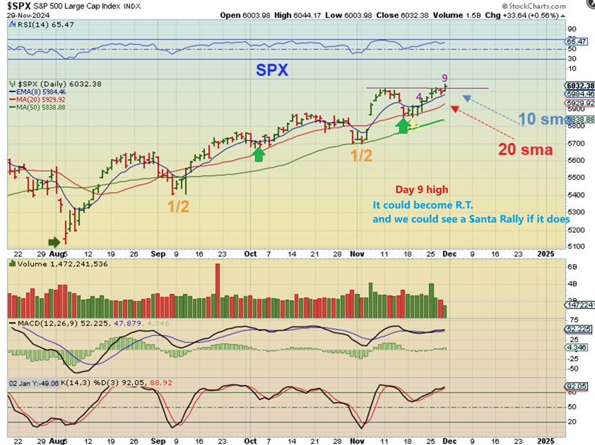 SPX – Using a daily count we see that the SPX peaked on day 9 so far and that is at all-time highs in this 3rd daily cycle. If it continues to climb or even chop higher, it will have a good chance of becoming a R.T. Daily cycle and we could see that ‘Santa Clause Rally’ that comes at the end of a year. In the back of my mind I have had concerns with the SOXX failing, but at this point we just keep trading and raising stops and take what the bull markets will give us.
