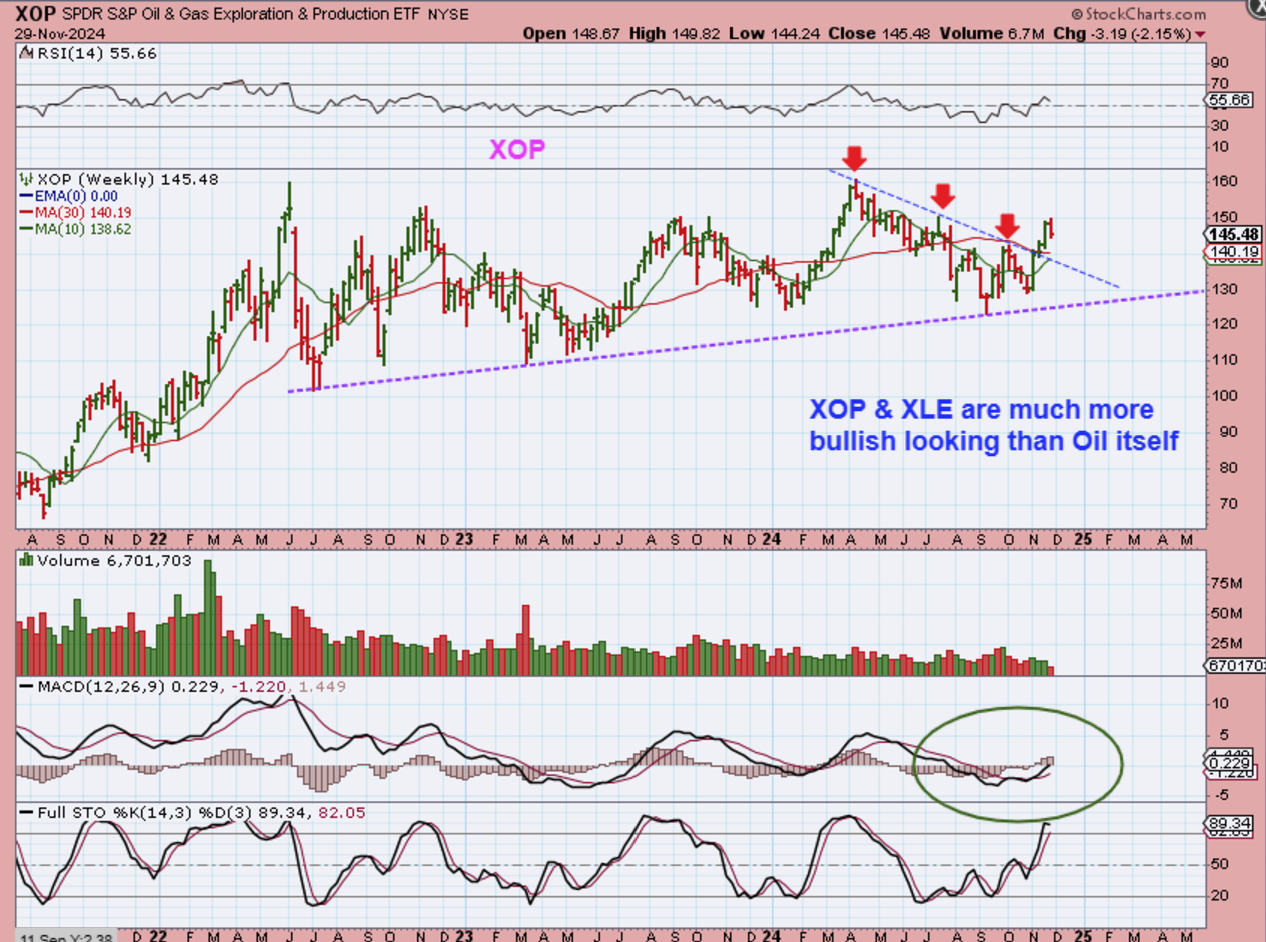THE XOP dropped too, but it has broken out from a downtrend and may drop down to back test it and the 30 week ma.