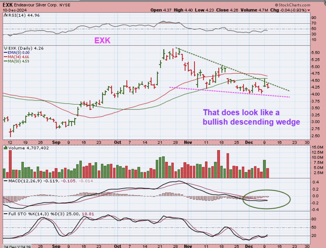 GDX & Some of the Miners like EXK were rejected at the 50sma, but this does look like a bull wedge, so it may only drop to the $4 area and you’d be buying it at the recent lows.