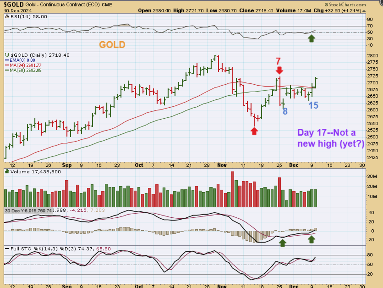 Gold is moving up with the USD again, so this shows us that even if the USD did remain strong, it has now and likely will not keep Gold from running again. Gold has a day 7 peak, and I’d actually like to see that stay that way to remain L.T. and give us a sudden swift dip into a new low. So…