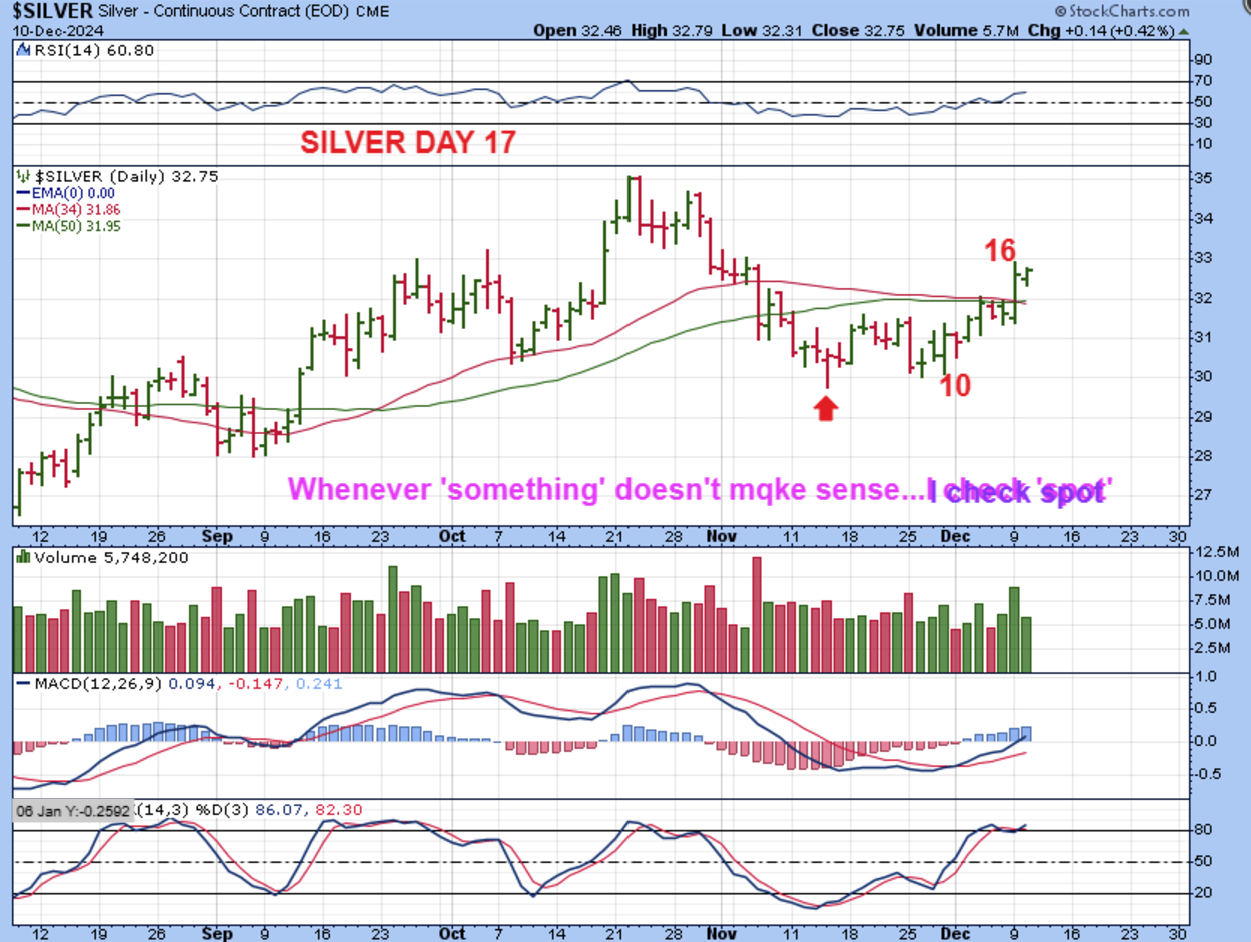 SILVER : I don’t like to go to spot when I usually use Stockcharts, but I did notice that SPOT would give this a different set up. The real low (dcl) comes in later, so this would only be day 9 and could form as a final L.T. daily cycle, possibly also explaining why the silver stocks are stalling?