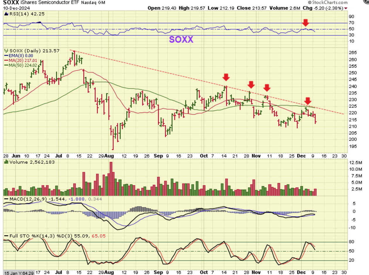 THE SOXX, however, certainly makes it look like it wants to just sell off. If it does, I have to wonder if the other sectors will be dragged lower too. This is the 3rd daily cycle and could play out weaker as the timing gets later. As pointed out weeks ago – The SOXX has lower highs and lower lows (a downtrend has begun)