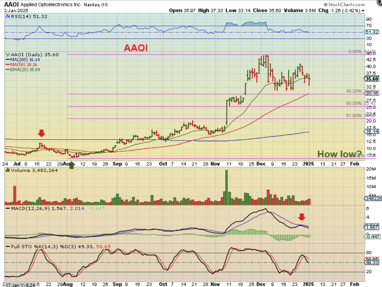 I traded AAOI (small positions unfortunately) and I like that strength that it had, so I’m keeping an eye on it during the ICL drop. So far we have a choppy topping area, and it dropped from $45 to $32 already, but how much will it sell off? We won’t know until we get to the ICL. It could form a large inverse H&S.