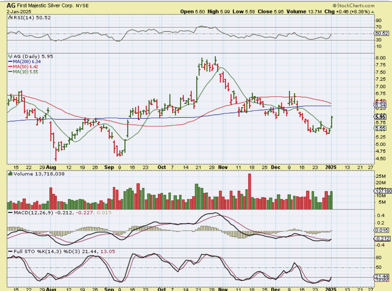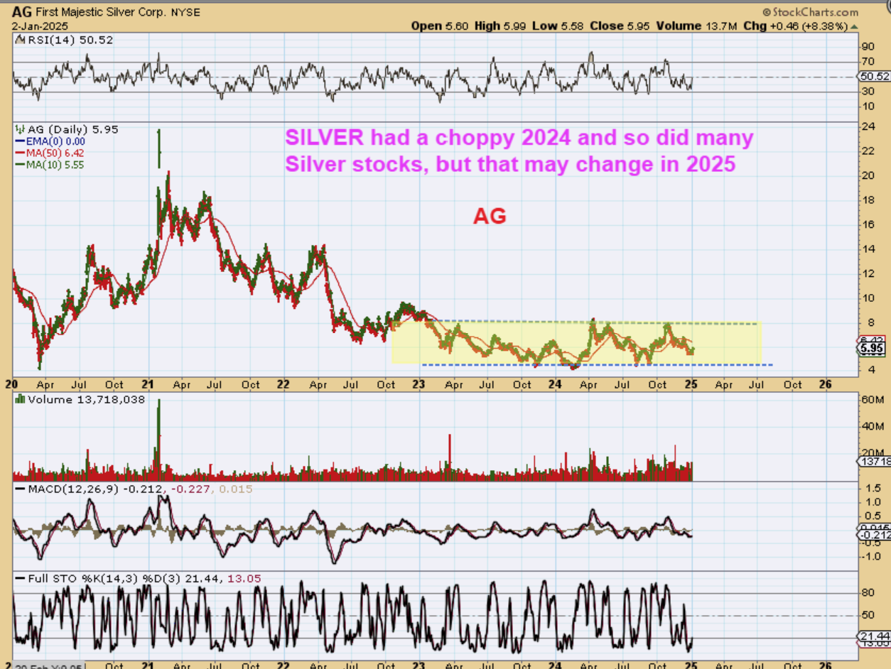 Next, I want to show you something. We know that Gold broke to new highs and rallied strongly in 2024, but Silver remained choppy. I think that Silver could have a very strong year in 2025 and what does that mean for these choppy silver stocks that already doubled, but were very choppy? Let’s go back to ‘AG’…