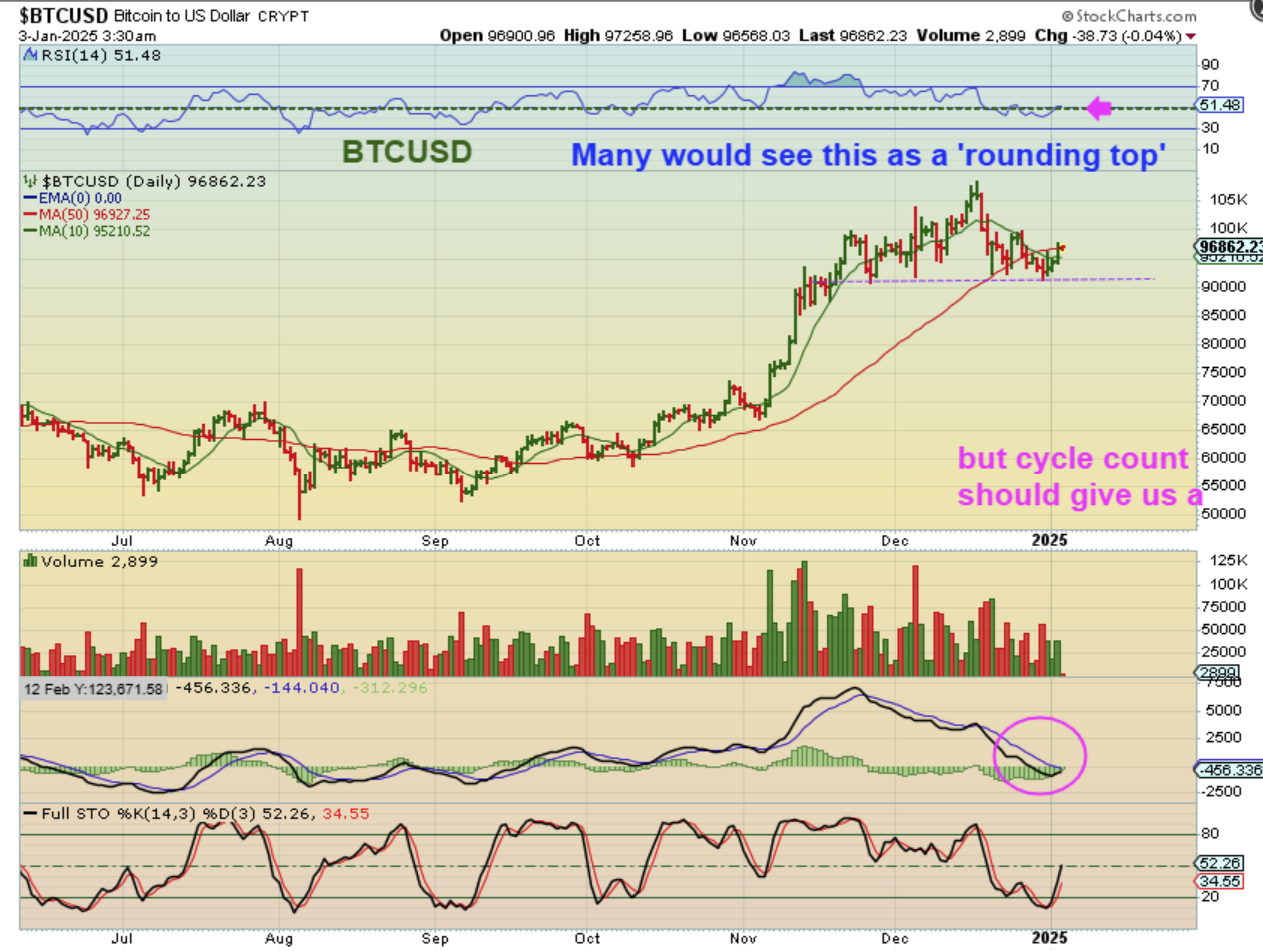 BITCOIN looks like a choppy H&S or a rounding top, but using cycles, it really should push higher. The crypto stocks did not fully follow it (yet). They were up 3-6%, but some rallied at the open up 13% and then sold iff to ‘up 5%’, so we’ll have to see how they do over time.