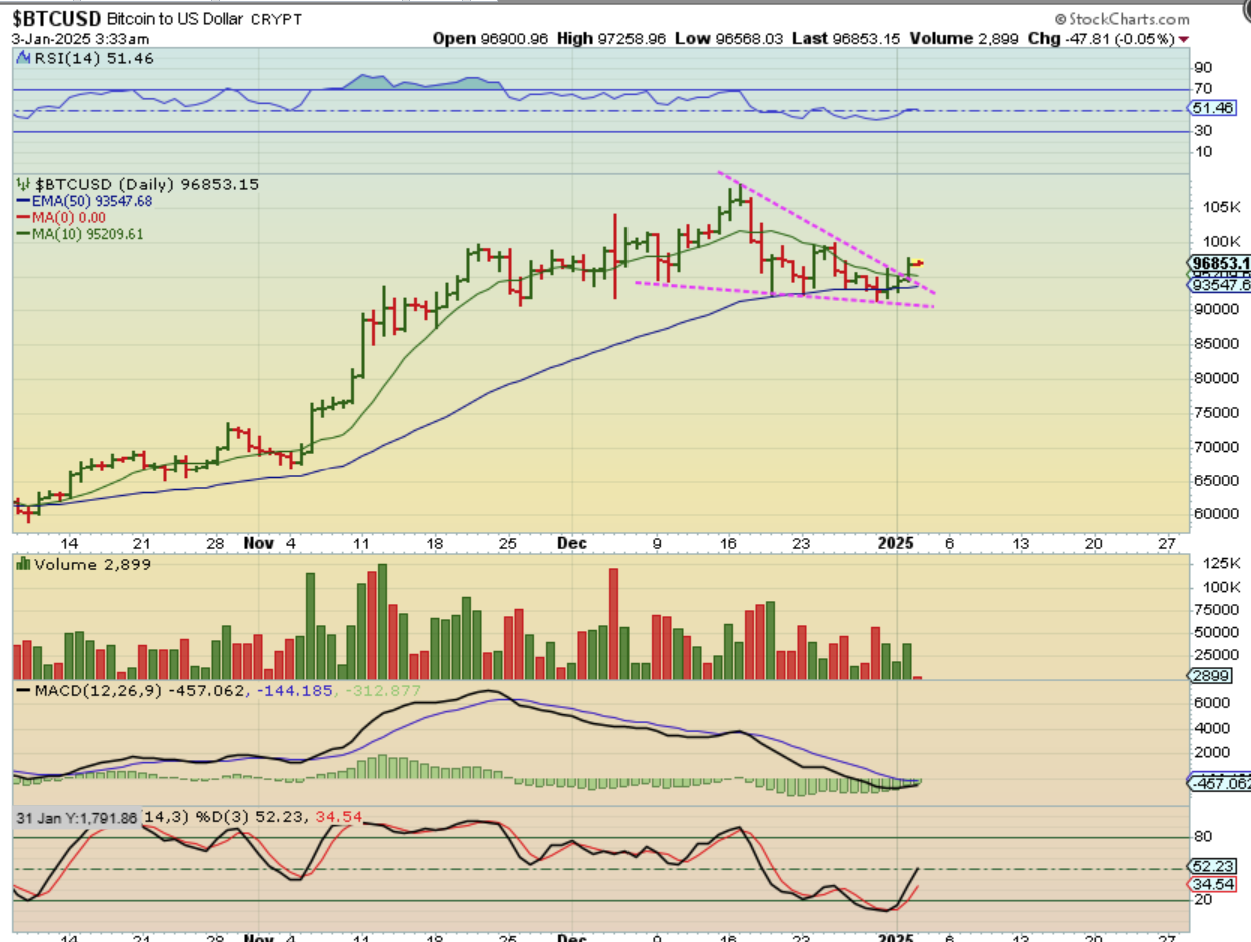 BITCOIN – Instead of a rounding top, I see a bullish wedge. Bitcoin is breaking out and could continue higher, but if it does dip and back test this breakout, it will be helpful to see what HUT, WULF, CIFR, MARA< RIOT, BTBT, MSTR, etc do then.