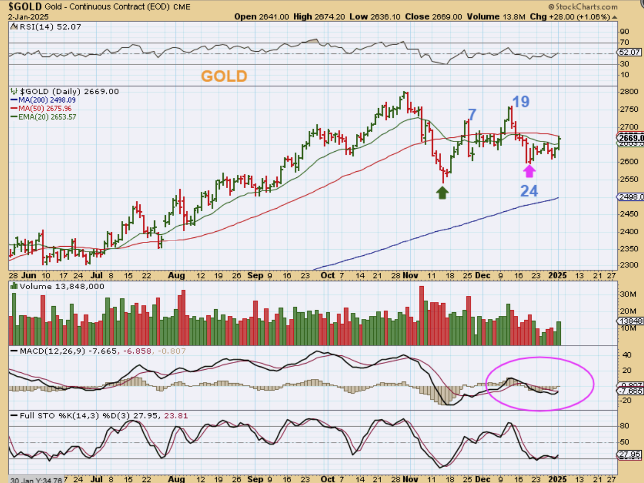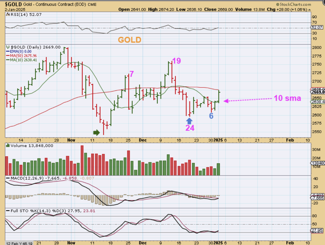 GOLD moved up almost $30 and ran up to the 50sma. We have been viewing Gold as having put in an ICL in November and possibly a short first daily cycle with a dcl around day 24. Let’s briefly discuss that…