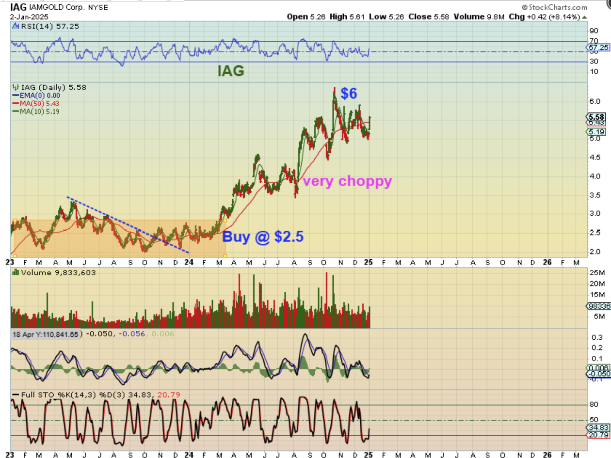 CDE lost and regained the rising 200sma. In 2024 CDE ran from $2.5 to $7.5+. These were very choppy, but I think that 2025 will be where Silver makes a strong break and if so? Silver stocks can double , triple, etc. I’ll discuss that shortly.