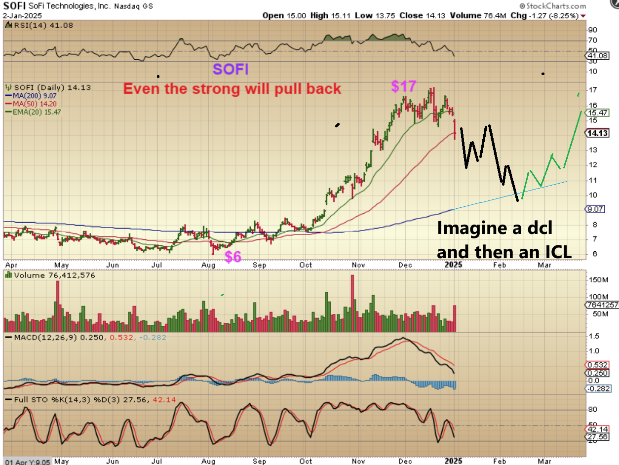 SOFI dropped to $6 in August, chopped around in that first daily cycle, then ramped up in October too. It held that 20 ema (green line) until recently, so now we’ll see how it acts or how deep it goes during an ICL drop. Currently it looks like a ‘h & s’ pattern. Could this drop to the 200sma? It doesn’t seem so, right?…