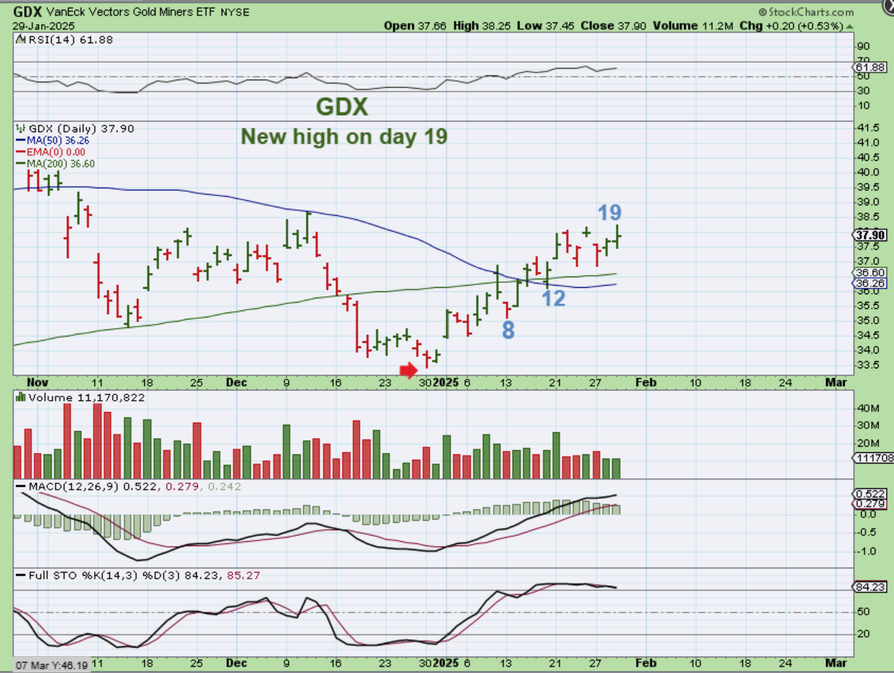 GDX has been moving higher in a choppy manner for the entire run out of the lows. It only looks like day 18 for the GDX.