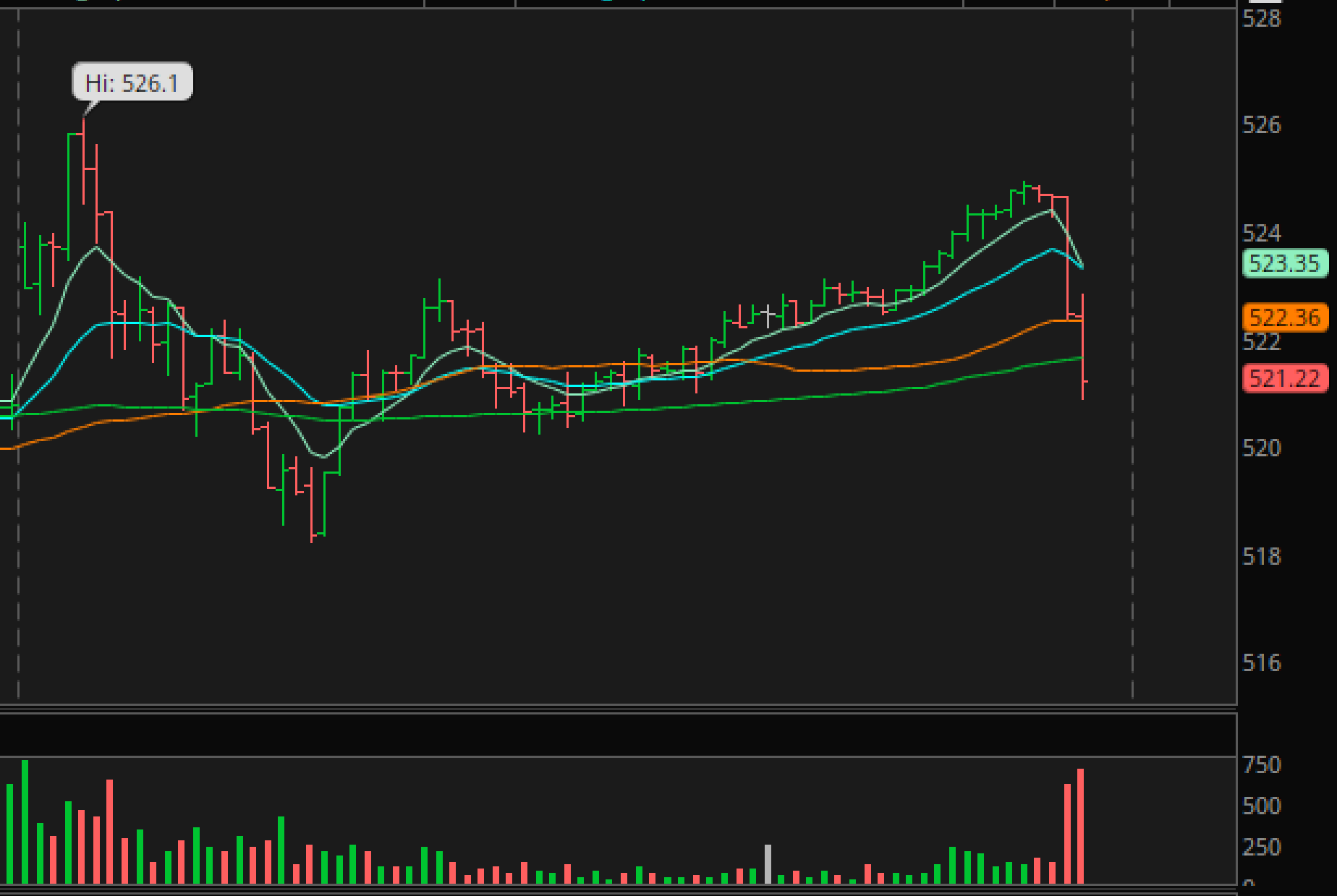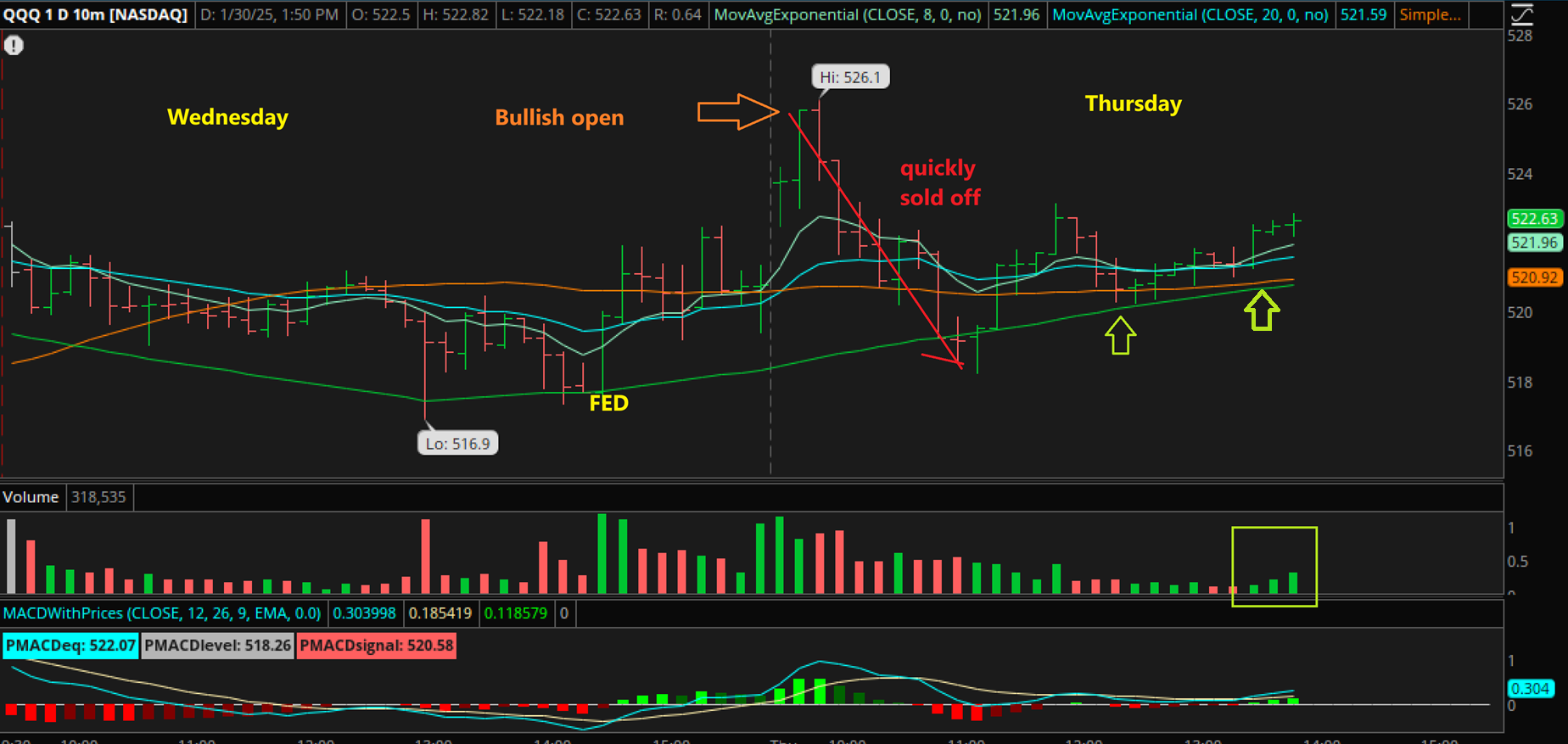 QQQ Intraday: Just to show you what that looks like intraday, we see the run higher at the open, a fast or sharp sell off, and then the markets looked ready to recover, so I posted this chart to say that I think we’re going higher. And we did go higher, until…recovered