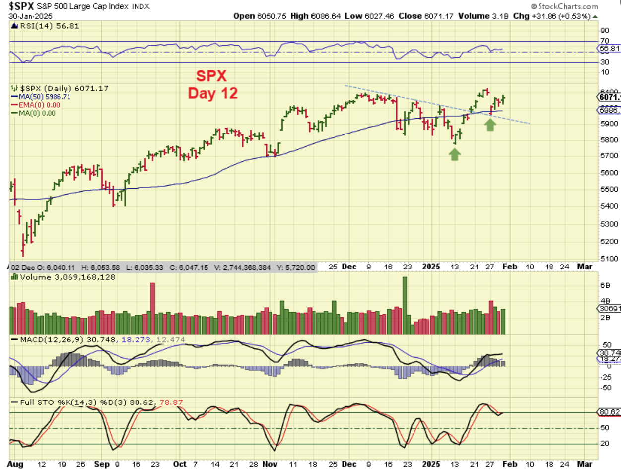THE SPX: The General Markets gapped up higher at the open, then they sold off quickly to the lows that you see, and recovered by the end of the day. On this chart it looks like a normal up day, and this is day 12. The markets do look like they’ll continue higher over time.