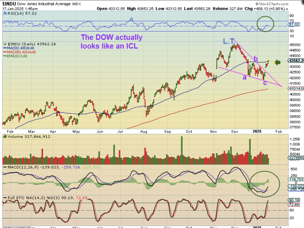 The DOW JONES really looks like an ICL. This doesn’t resemble a weak 5th daily cycle as it tries breaking above the 50sma. I see a bullish descending wedge, and a-b-c drop, a higher high on this bounce and the RSI crossed the 50 mark. etc.