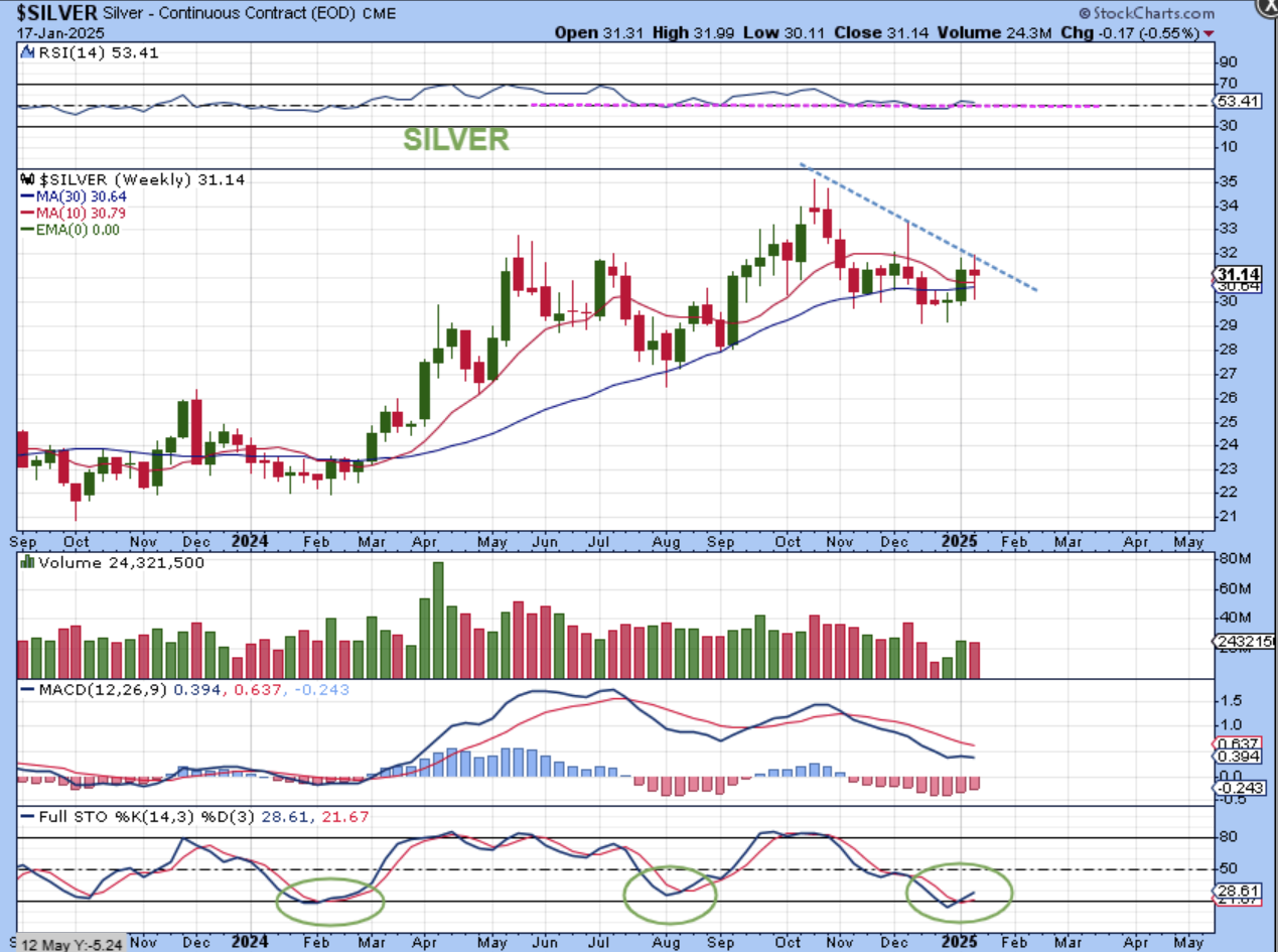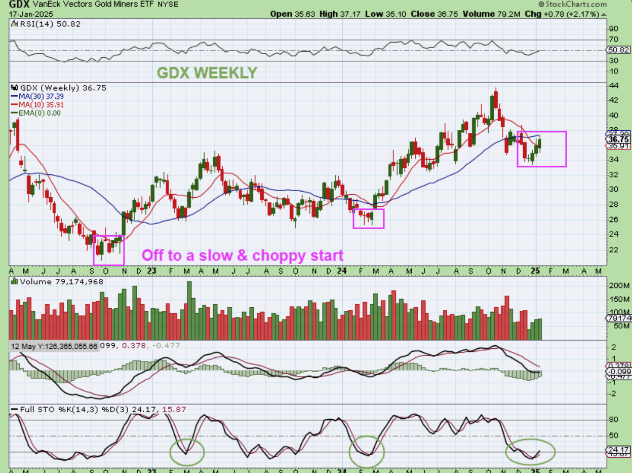 GDX WEEKLY – This does not look bad at all, but many individual Miners are choppy and frustrating. The weekly Stochastics is oversold here too, as much as prior ICLs. Price has 3 weeks of gains and now we have to see if it can get above the 30 week ma. If Gold continues higher and Silver breaks out, GDX should be able to breakout too. Silver does have a tendency to put in choppy bottoms, as seen in the magenta boxes, and this one is actually more progressive than the others.