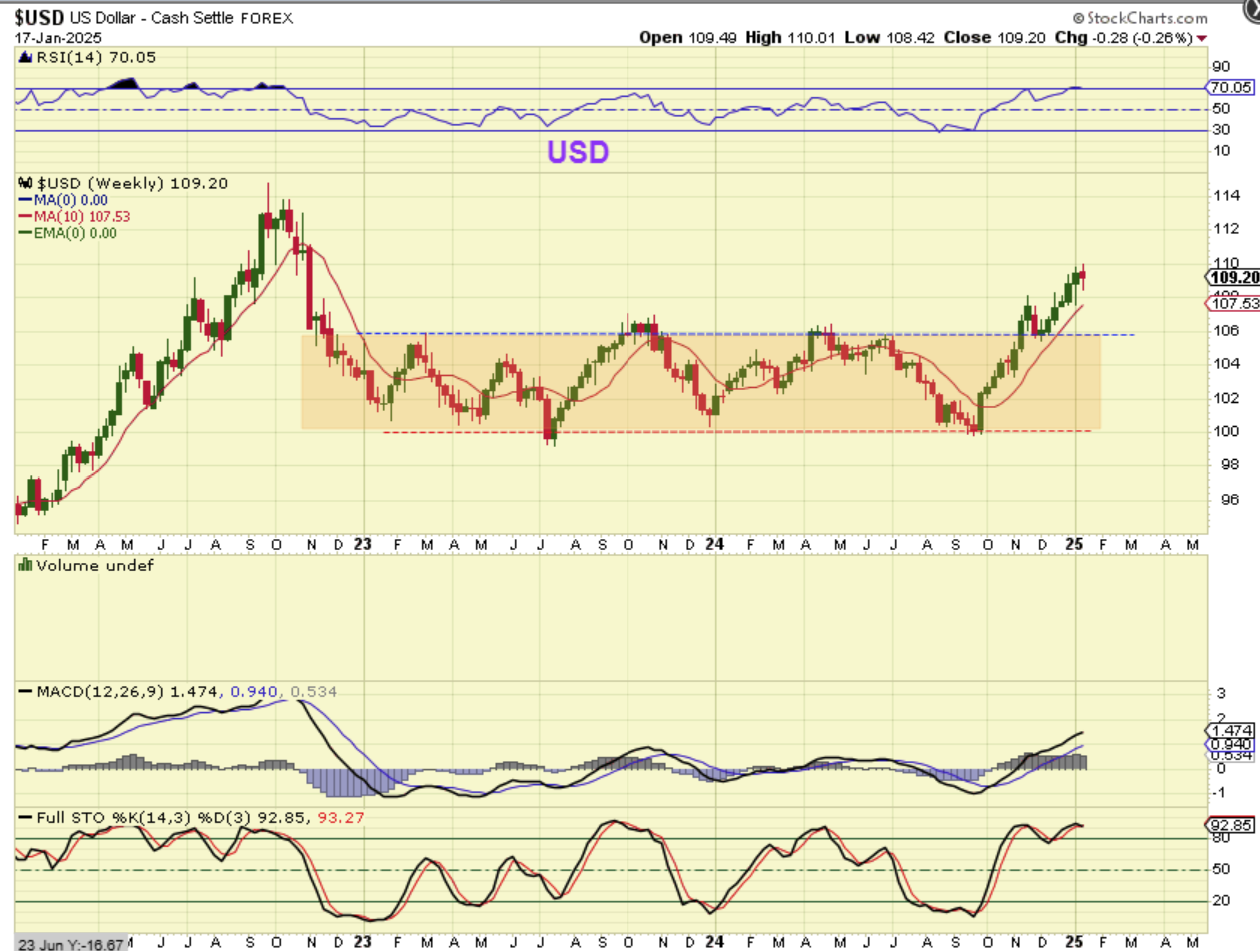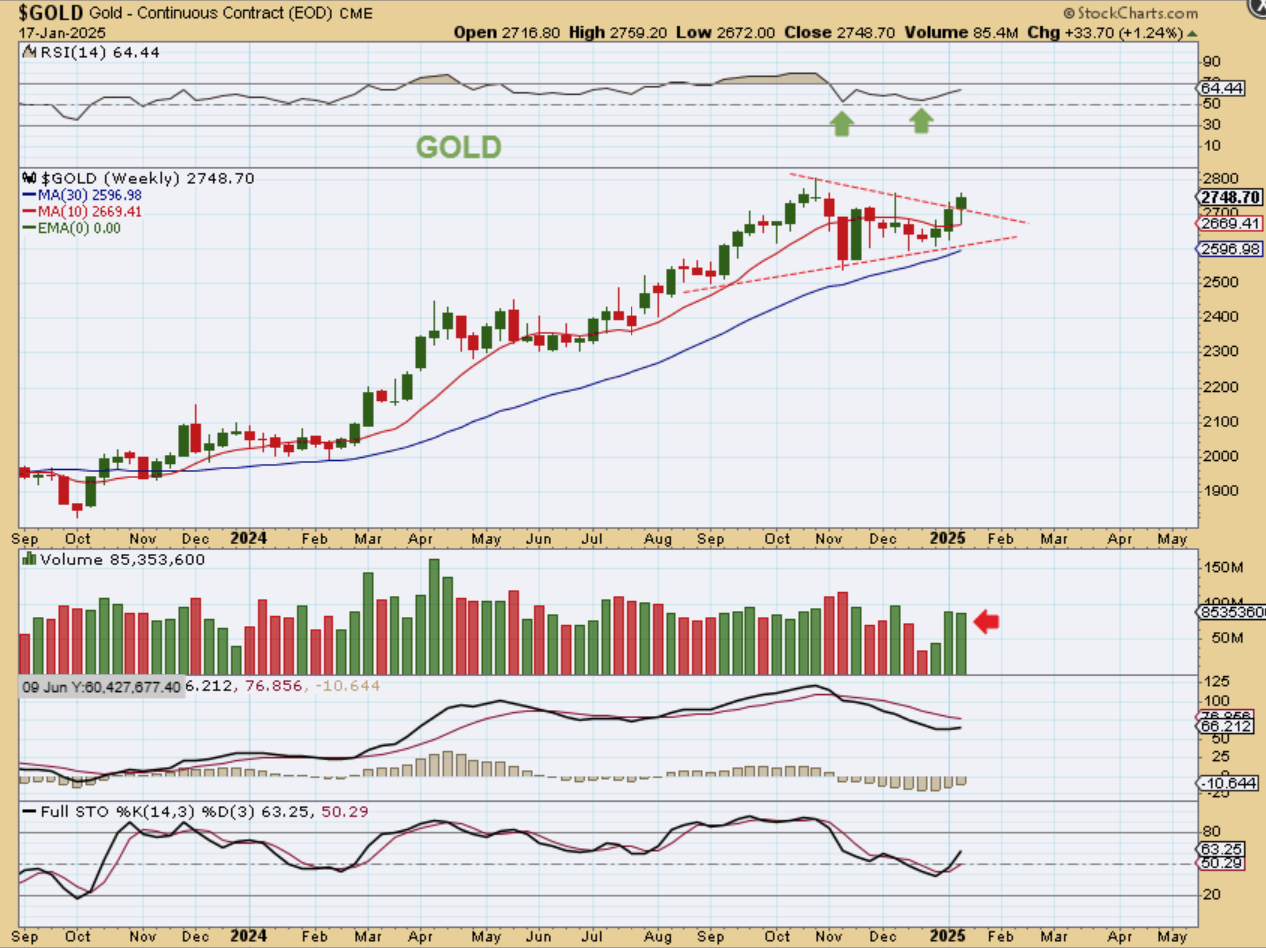 GOLD WEEKLY – Last week I said that Gold was a bullish set up and that we could see Gold break out as soon as this week.  Well, we did. Gold broke out. Gold is still a really bullish looking set up. It dropped down to the 10 week ma and then broke out, but the Miners are struggling to perform as well as Gold. Hopefully that changes soon.