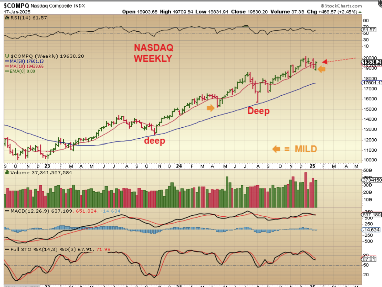 THE NASDAQ WEEKLY shows a couple of deeper ICLs and milder ones. In past runs higher, price runs up the red 10sma, and it has regained that moving average this week.