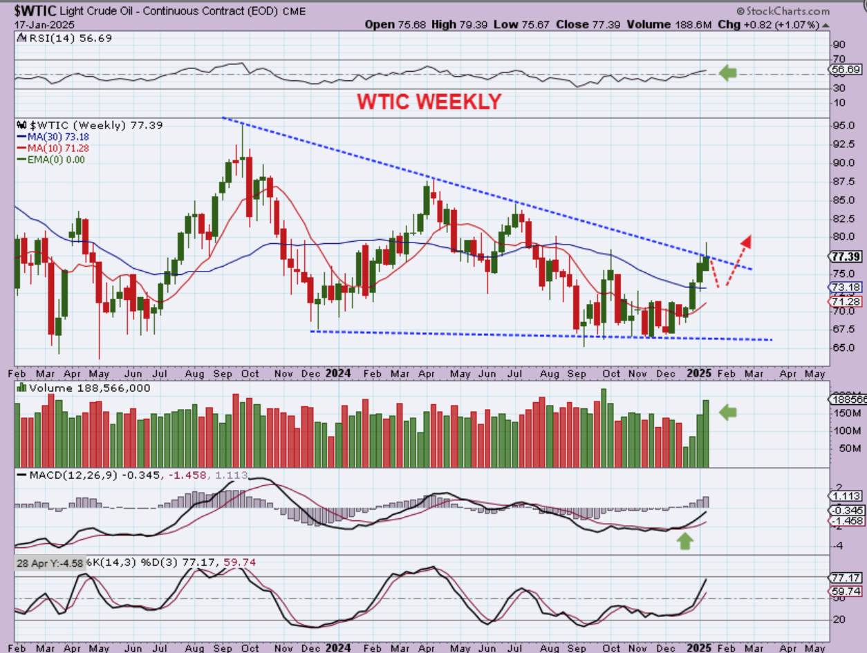 WTIC WEEKLY – Oil broke out this week from the downtrend, but it did pull back and close back under it.  Volume is increasing, so this isn’t really likely to be a false breakout for very long.