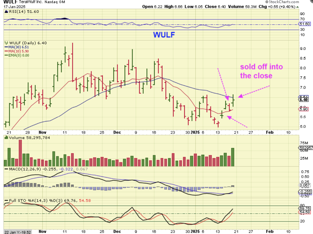 WULF:  The daily chart shows how each day price ran, but could not hold the highs. Every day they sold off and every day last week I found that to be frustrating, but again, up 18% for the week is great, so we either