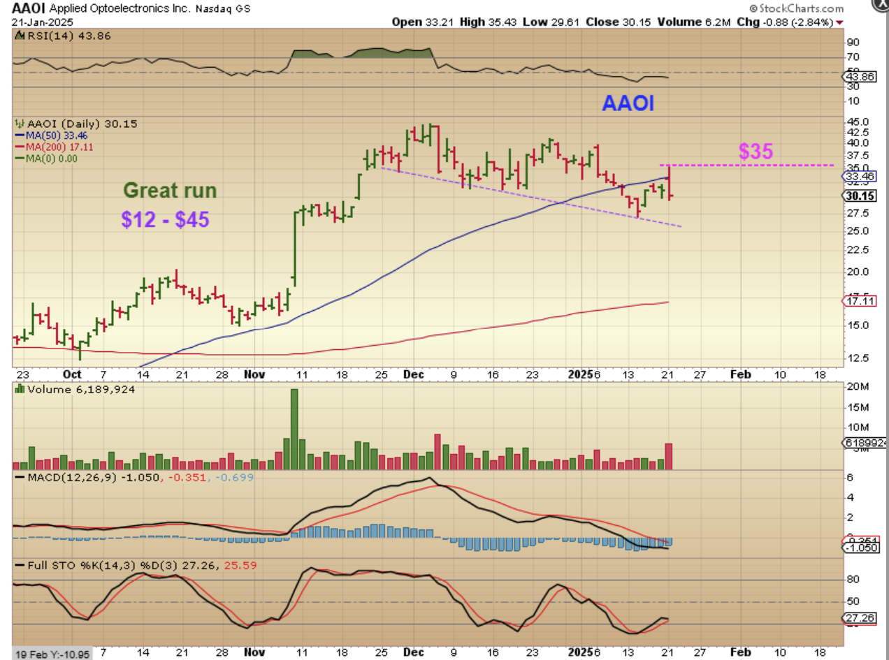 AAOI was also one of my favorites that I traded last year, it made an amazing run. It actually popped and dropped yesterday at the 50sma though. I almost bought this, but I had grabbed some Quantum stocks instead. I’ll keep my eyes on this one for a close above the 50sma as a possible buy.