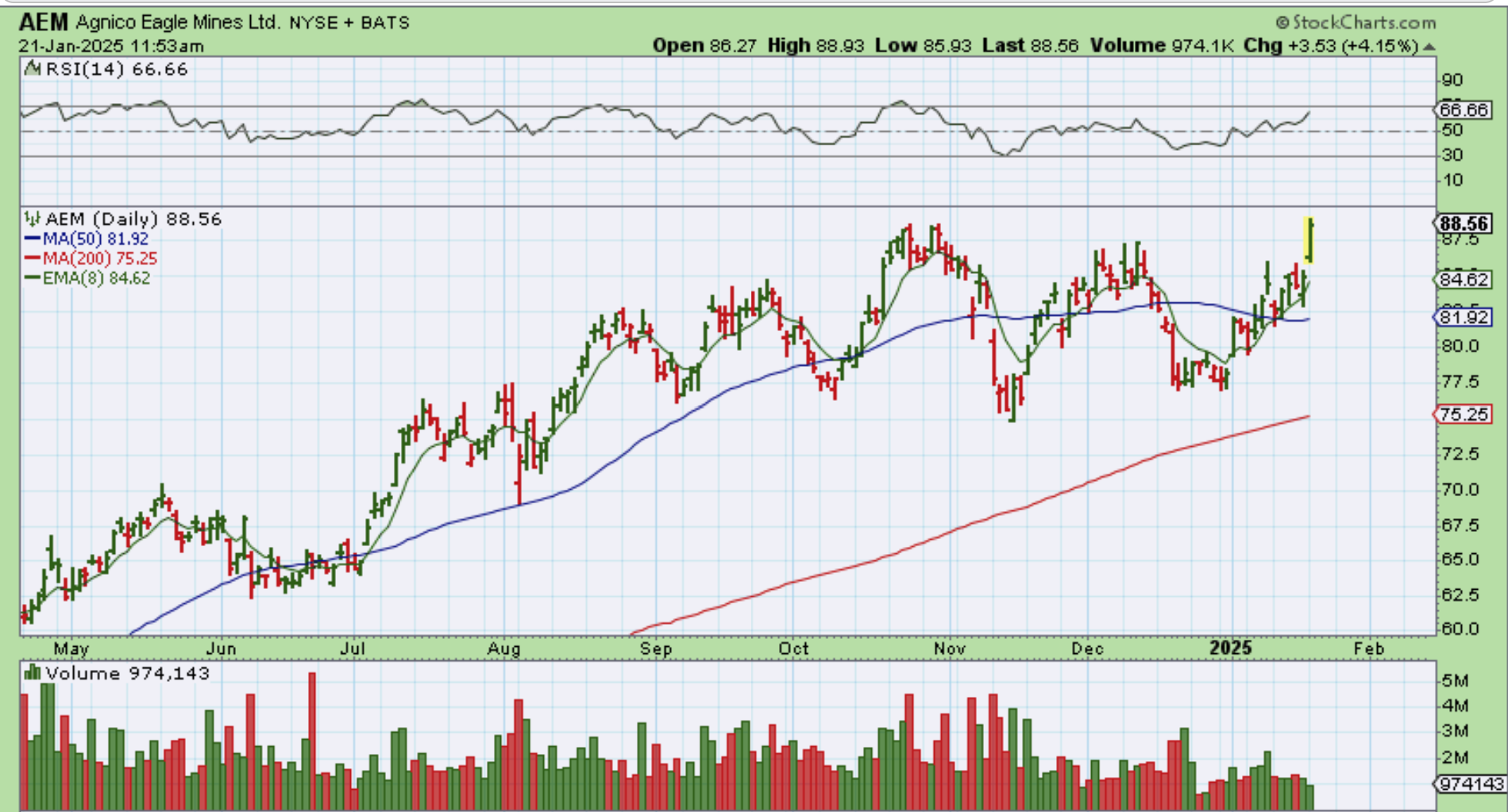 AEM, KGC, IAG, AU, HMY, etc -these are running back to their highs, and you can see AEM here up 4% Tuesday Morning. You can see the strength, because it actually made a higher low when the GDX broke down below the 200sma, but some other miners are REALLY lagging.
